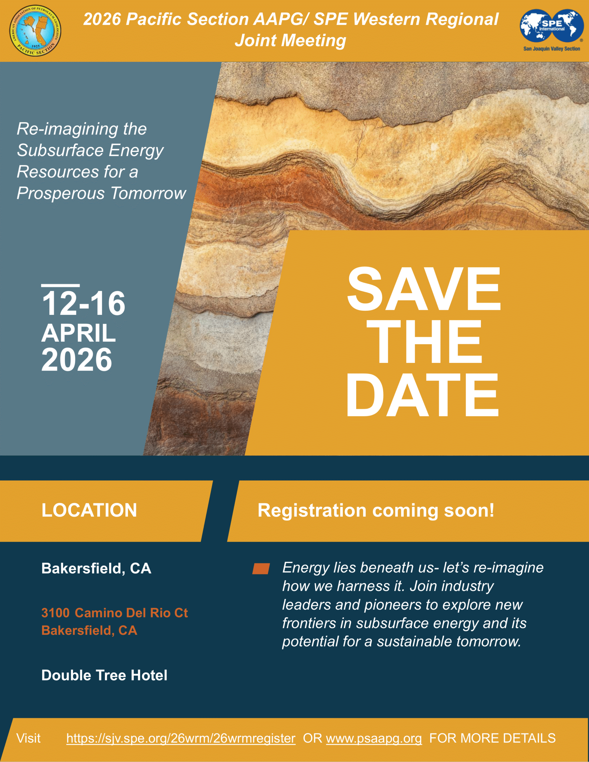 We are pleased to announce the 2026 Pacific Section AAPG/SPE Western Regional Joint Meeting. Click the image below or visit sjv.spe.org to become a sponsor, register or find other information.